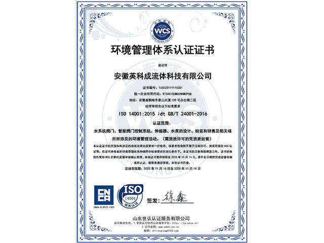 • 環境管理體系認證證書
